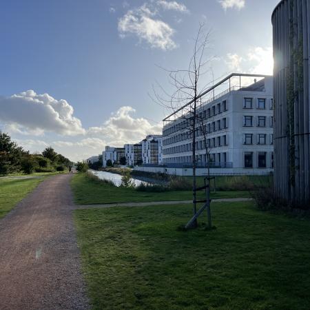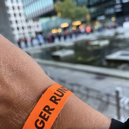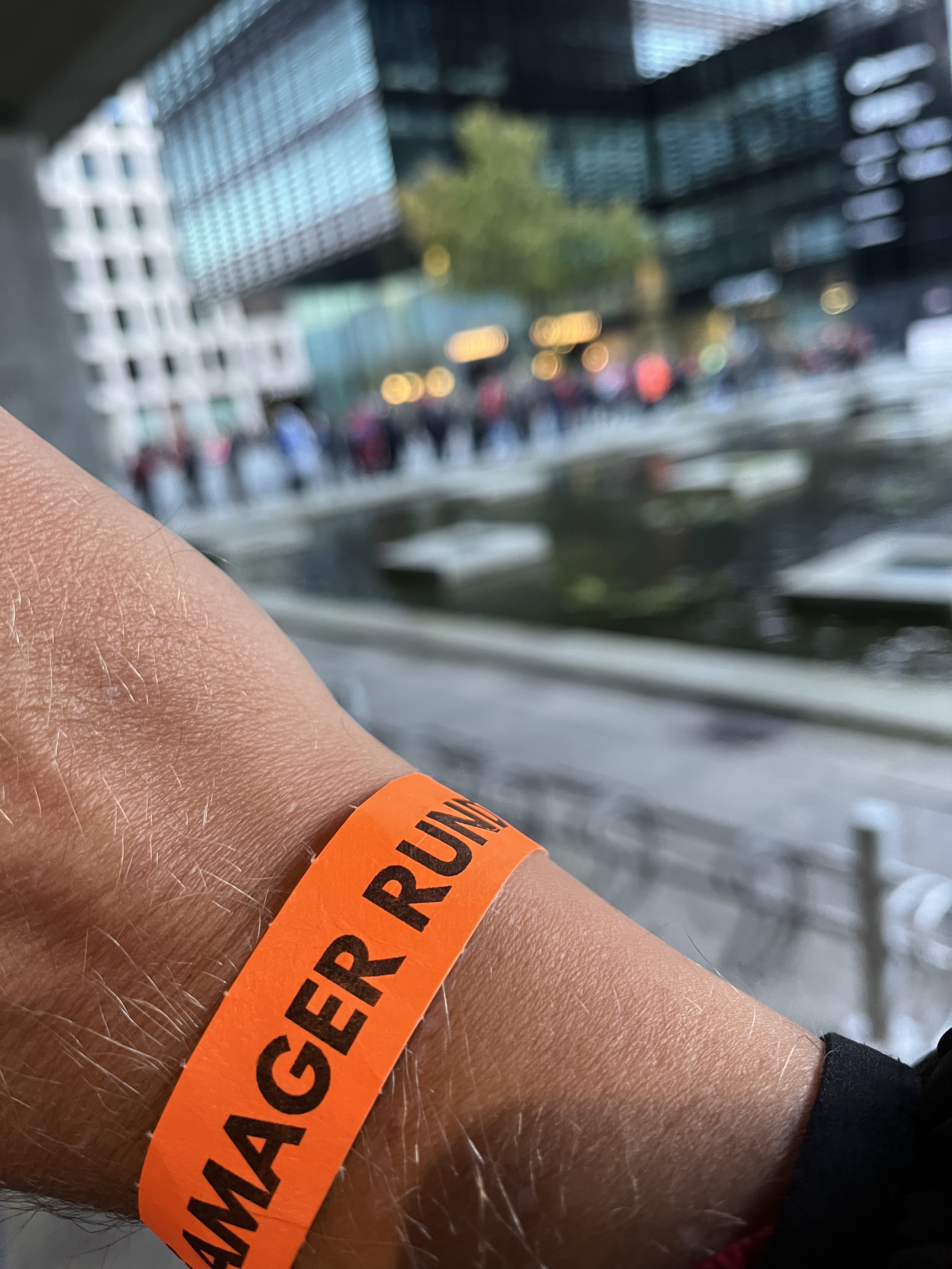 Der var en sidste detour, og den sendte os over på østsiden af Ørestad, hvor jeg aldrig havde været. Her gik man langs en stor kanal, og havde udsigt til bagsiden af alle Ørestad Boulevards store firkanter, imens Ferringbygningen (eller hvad den nu har skiftet navn til) åbenbarede sig i det fjerne, og indikerede hvor målet var. Herfra var det lidt som gaden i den klassiske roman "Momo" af Michael Ende, hvor uanset hvor hurtigt man gik, så kom mållinjen aldrig nærmere. Men det gjorde den så alligevel, og pludseligt var det overstået.