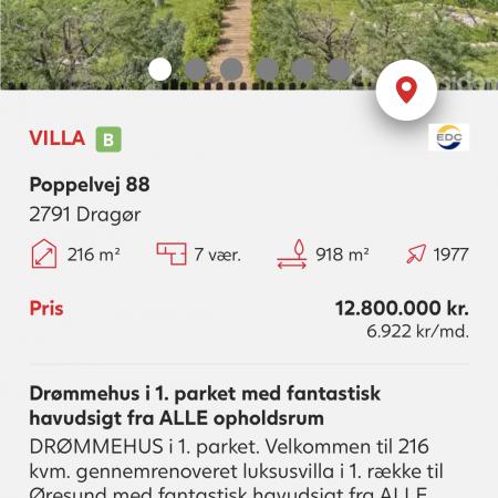 Nord for Dragør i første parket til vandet, kunne man købe dette fine gule hus, der blot stod i 12,8 millioner. Det var 5 millioner dyrere end syd for Dragør, hvor der var et tilsvarende hus til blot 7,3 millioner. Jeg tror jeg bliver i Køge.