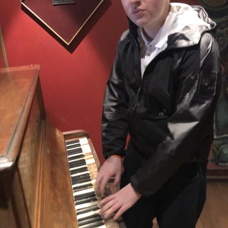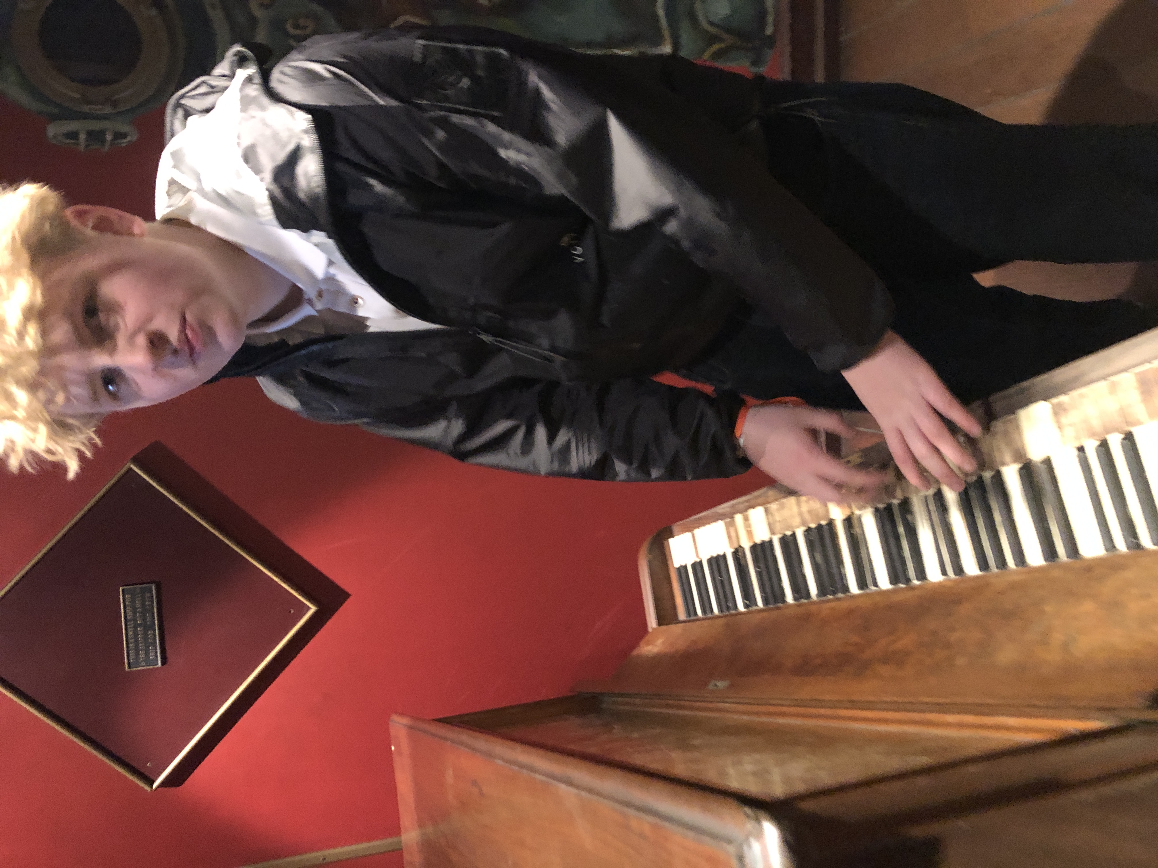 Vi var alle i det mystiske hus Hurlumhej, der nærmest var en simulator i at have drukket lidt for mange øl, med de skæve trin og hoppende trapper. Her giver Kelvin et nummer på pianoet.
