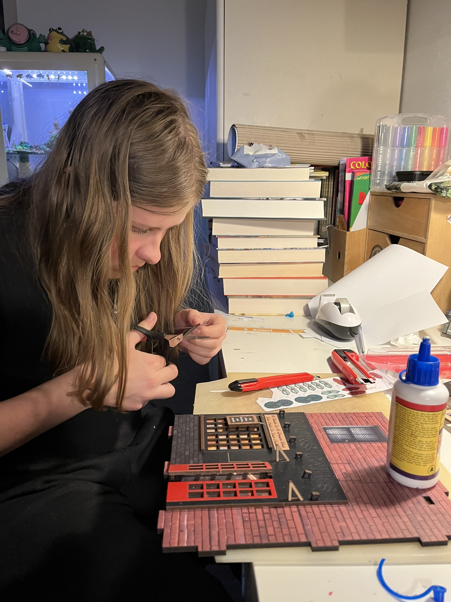 Det var Sylvester og jeg som startede med projektet, hvor etape et var at lime detaljer på en husmur, herunder vinduer, døre og skilte. Vi skulle også udklippe en lille markise, og montere den over en butik, nærmest som i virkeligheden.