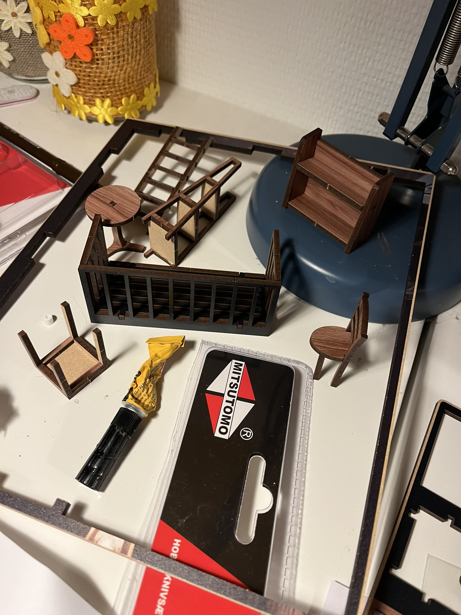 På første side i manualen var nævnt de 10-12 stykker værktøj og udstyr, som man skulle bruge, og som ikke var inkluderet, herunder flere slags lim, hobbyknive, en brun tusch og en miniskål med rørepind. Heldigvis kunne min kreative datter fremfinde det meste i "pusselrummet" bortset fra hobbyknive, men det fiksede et hurtigt besøg hos Harald Nyborg.