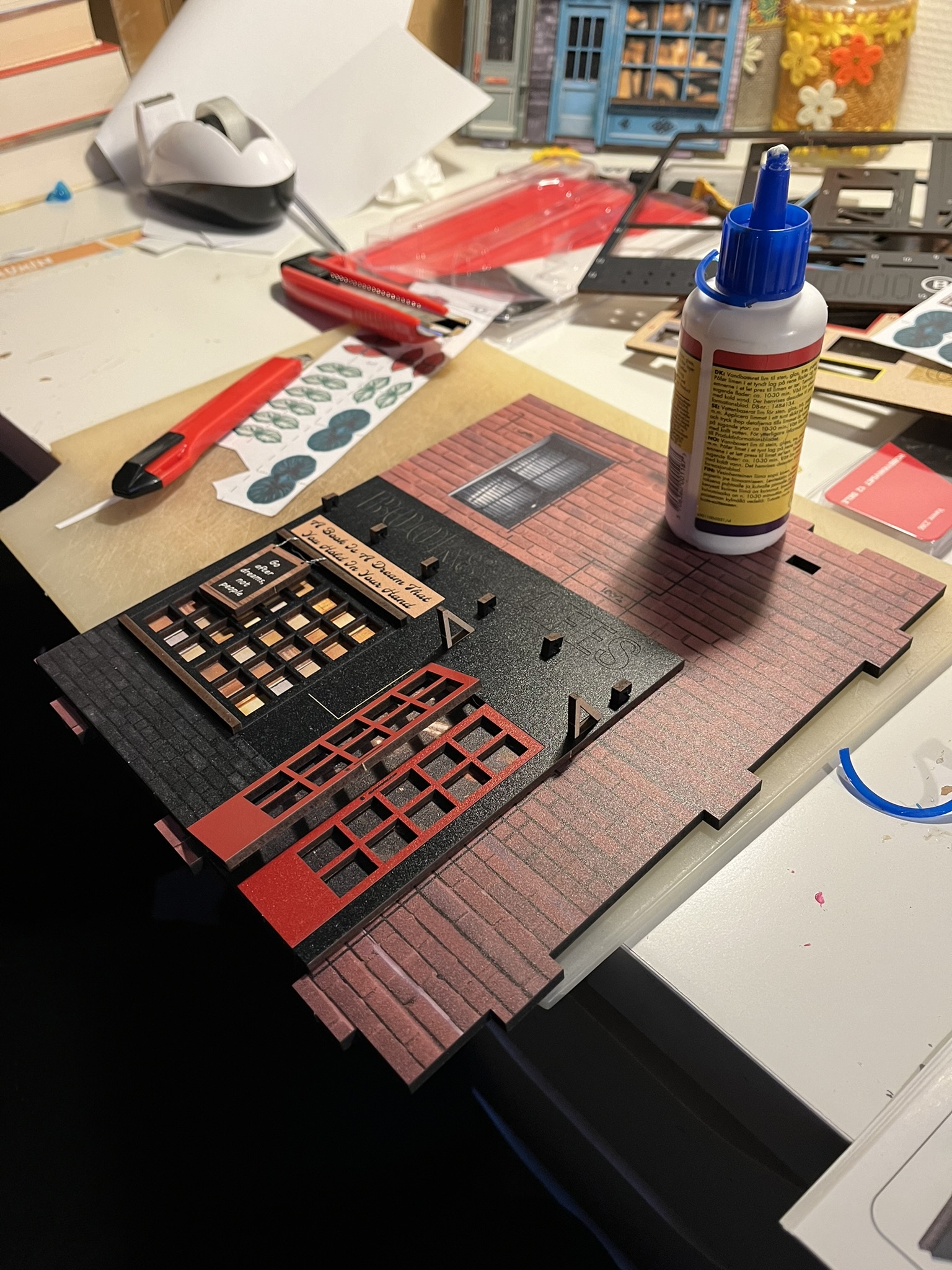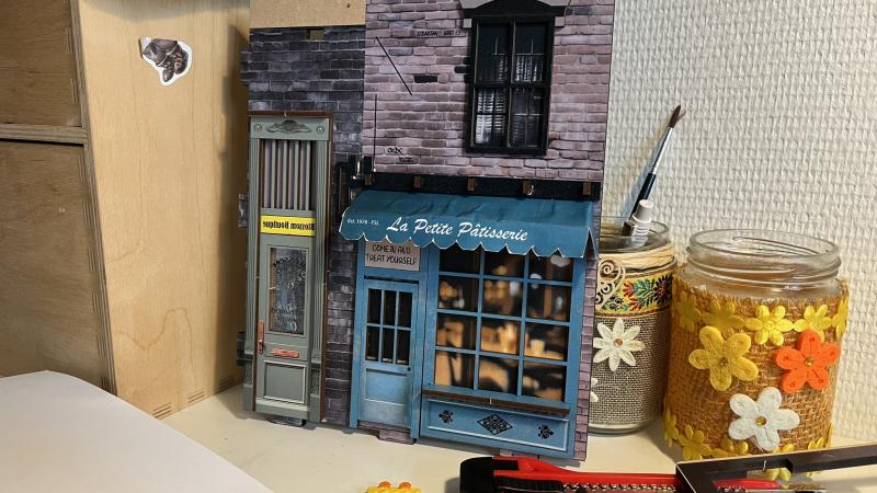 Det var Sylvester og jeg som startede med projektet, hvor etape et var at lime detaljer på en husmur, herunder vinduer, døre og skilte. Vi skulle også udklippe en lille markise, og montere den over en butik, nærmest som i virkeligheden.