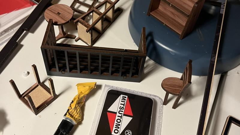 Fjerde etape bestod af adskillige møbler og andet tilbehør, herunder en balkon og en stige. Der skulle også samles en lille stol, hvor et af benene desværre var gået i stykker. Det var dog ikke værre, end at vi selv kunne reparere det med lidt lim.