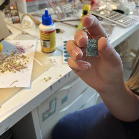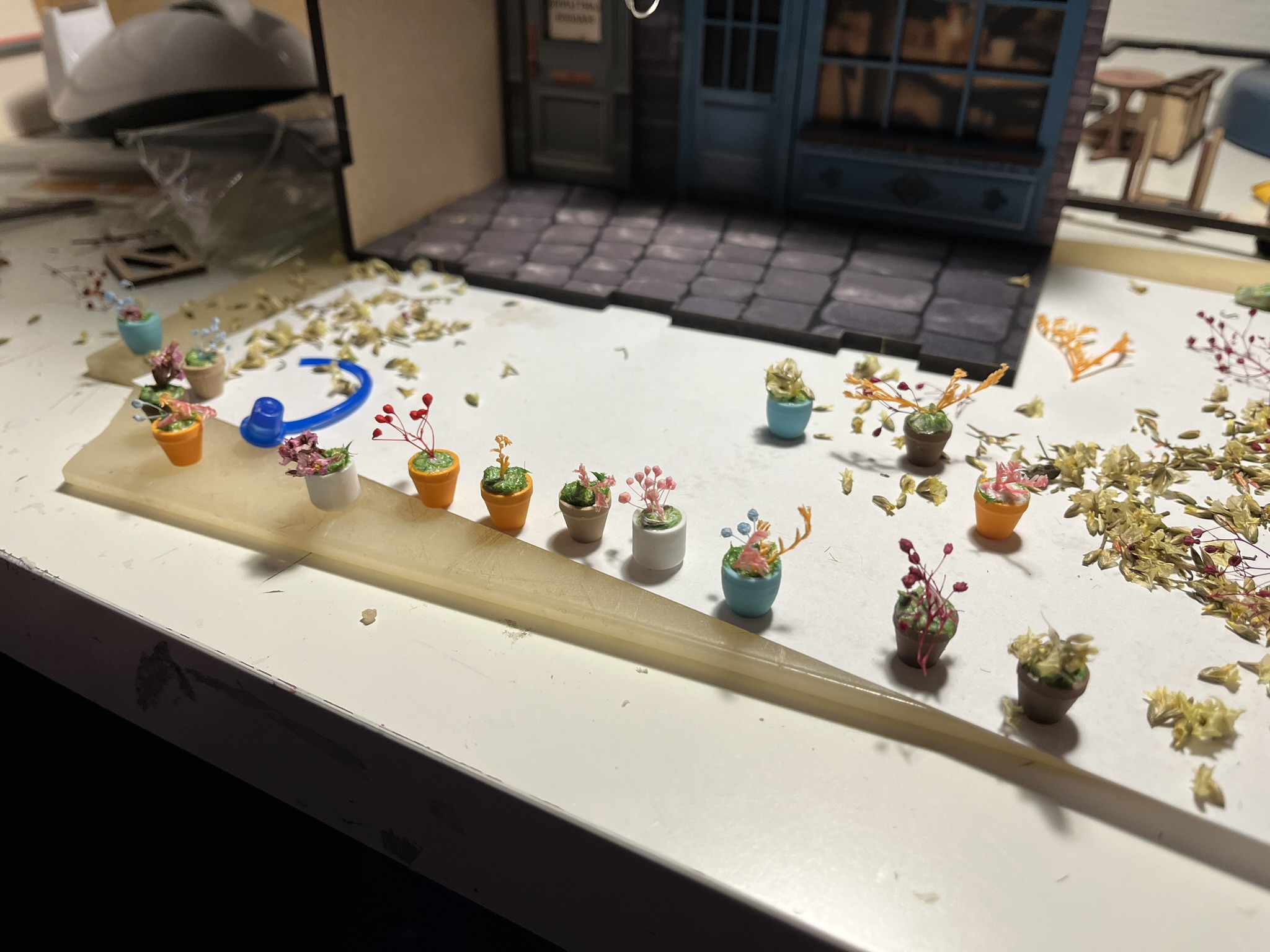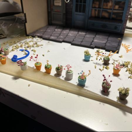 Femte etape var et kapløb imod uret, for her skulle man blande lim med kunstgræs, og udsmykke en række mikroskopiske potter med endnu mere mikroskopiske blomster, alt imens limen langsomt men sikkert blev mere og mere tør, og umedgørlig. Vi holdt dog hovedet koldt og det lykkedes os, at producere 16 små unikke potteplanter. Resten af kunstgræsset blev smurt på balkonen som mos.
