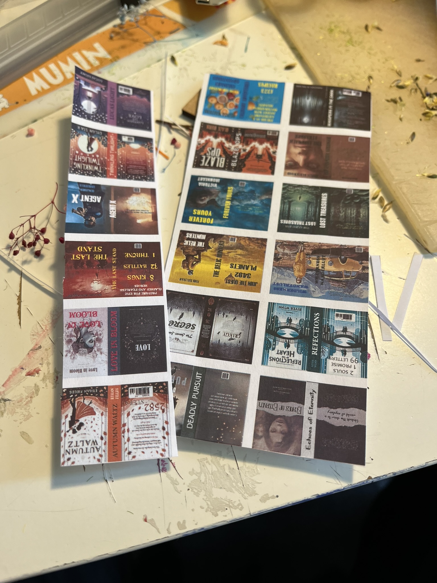 Den sidste etape var 30 minibøger, som minutiøst skulle have udklippet coverne, og gøres klar til at komme ind i en lille bogreol, hvilket bestemt også tog noget tid. Og så var der kun tilbage, at montere alle detaljerne og med et var vi færdige.