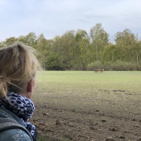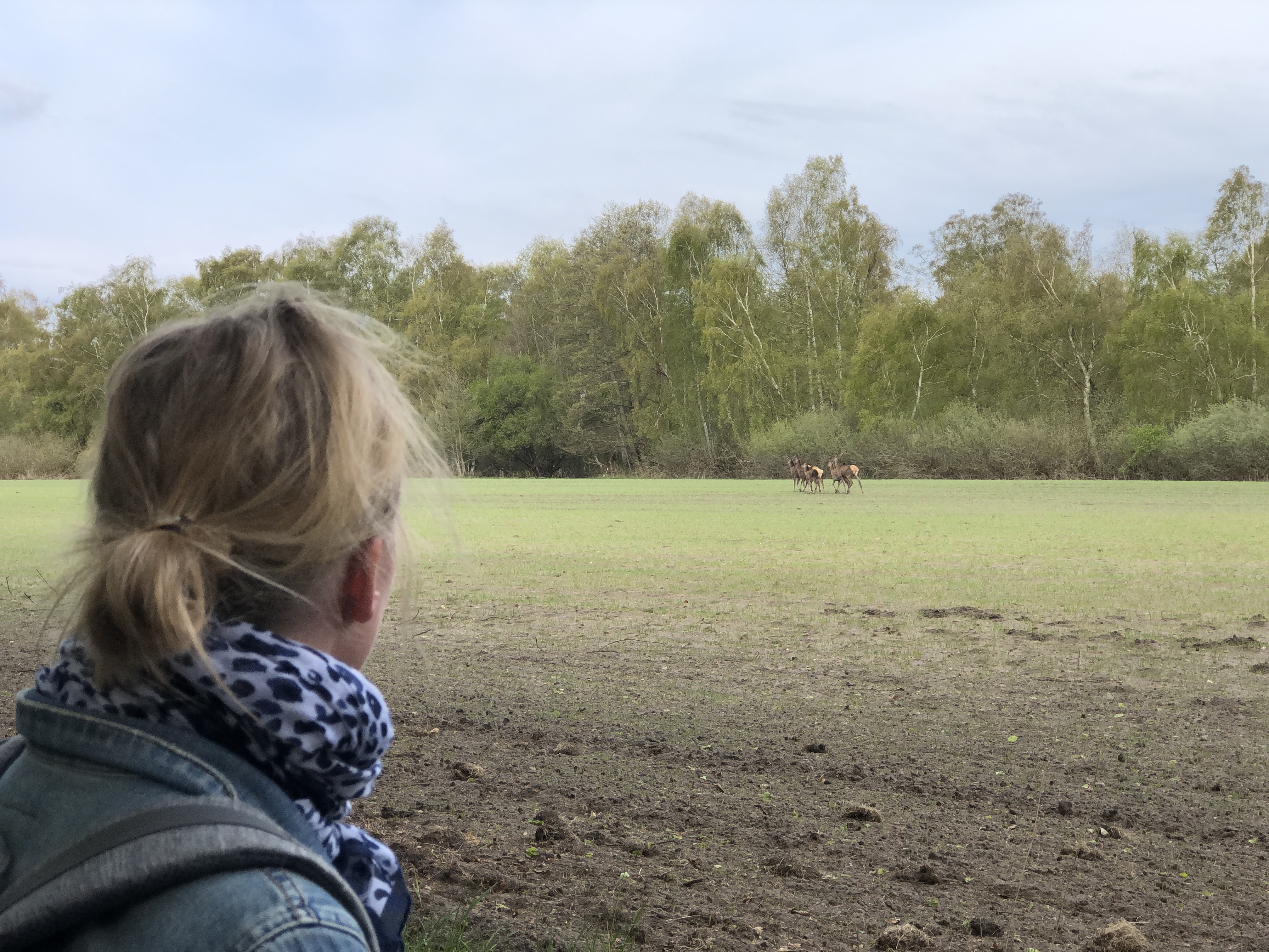 til udtryk ved et larmende tavst svar, da vi høfligt hilste på hende. Vi fortsatte nordpå, og pludselig spottede vi en flot dådyr i skovbrynet på den anden side af en mark. Vi betragtede dem musestille,