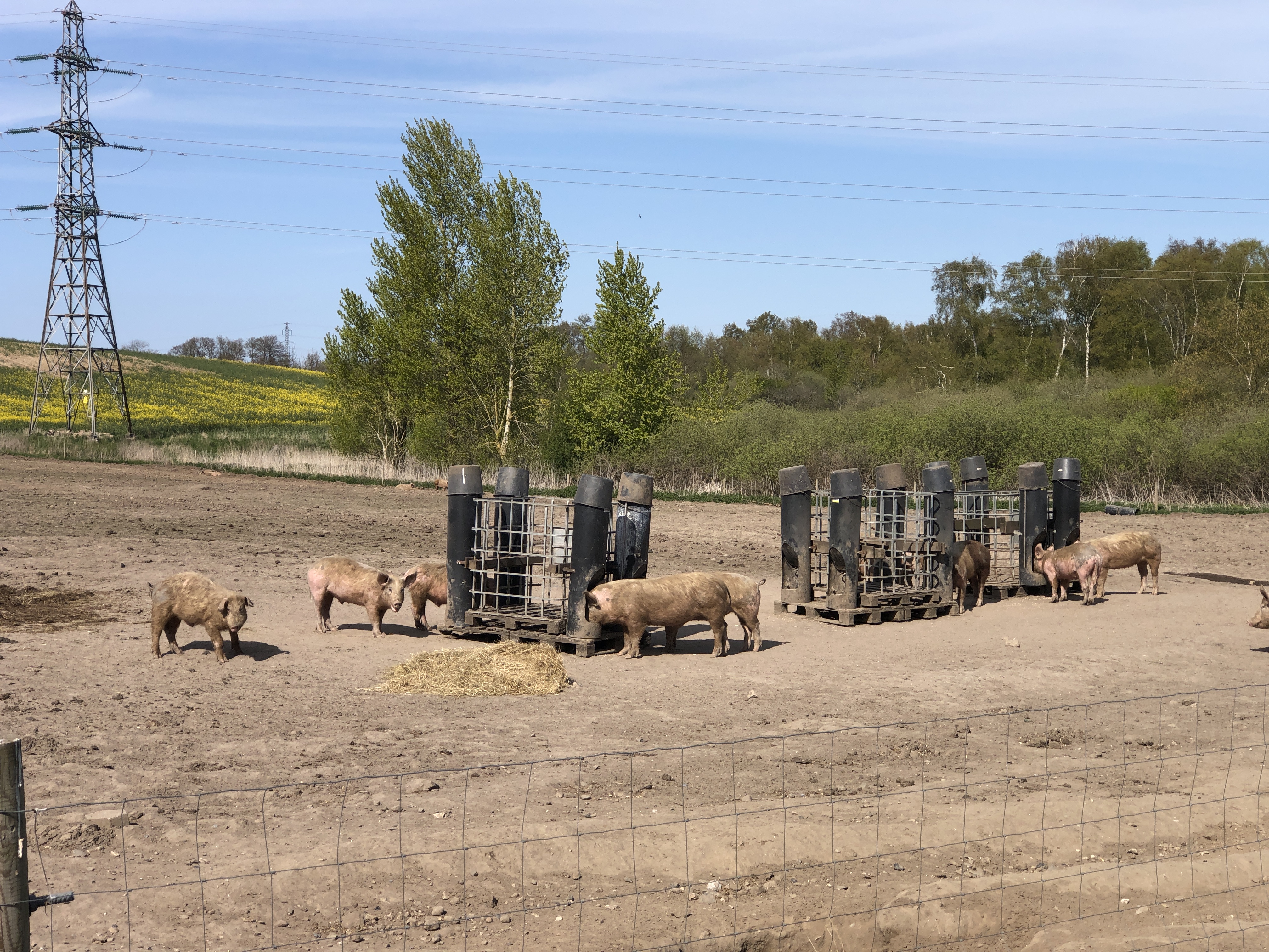af en flok herlige frilandsgrise, der gik, og hyggede sig på gårdens nordside.