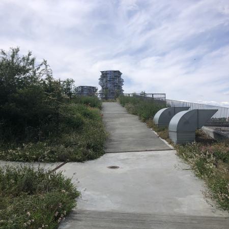 Stien fortsætter over et fletværk af gangbroer, der binder Hotel Tivoli sammen med det noget mere beskedne Cabinn, og herfra kan man nyde udsigten over jernbaneterrænet syd for København og byens mange alsidige bygninger med Kødbyen i forgrunden.