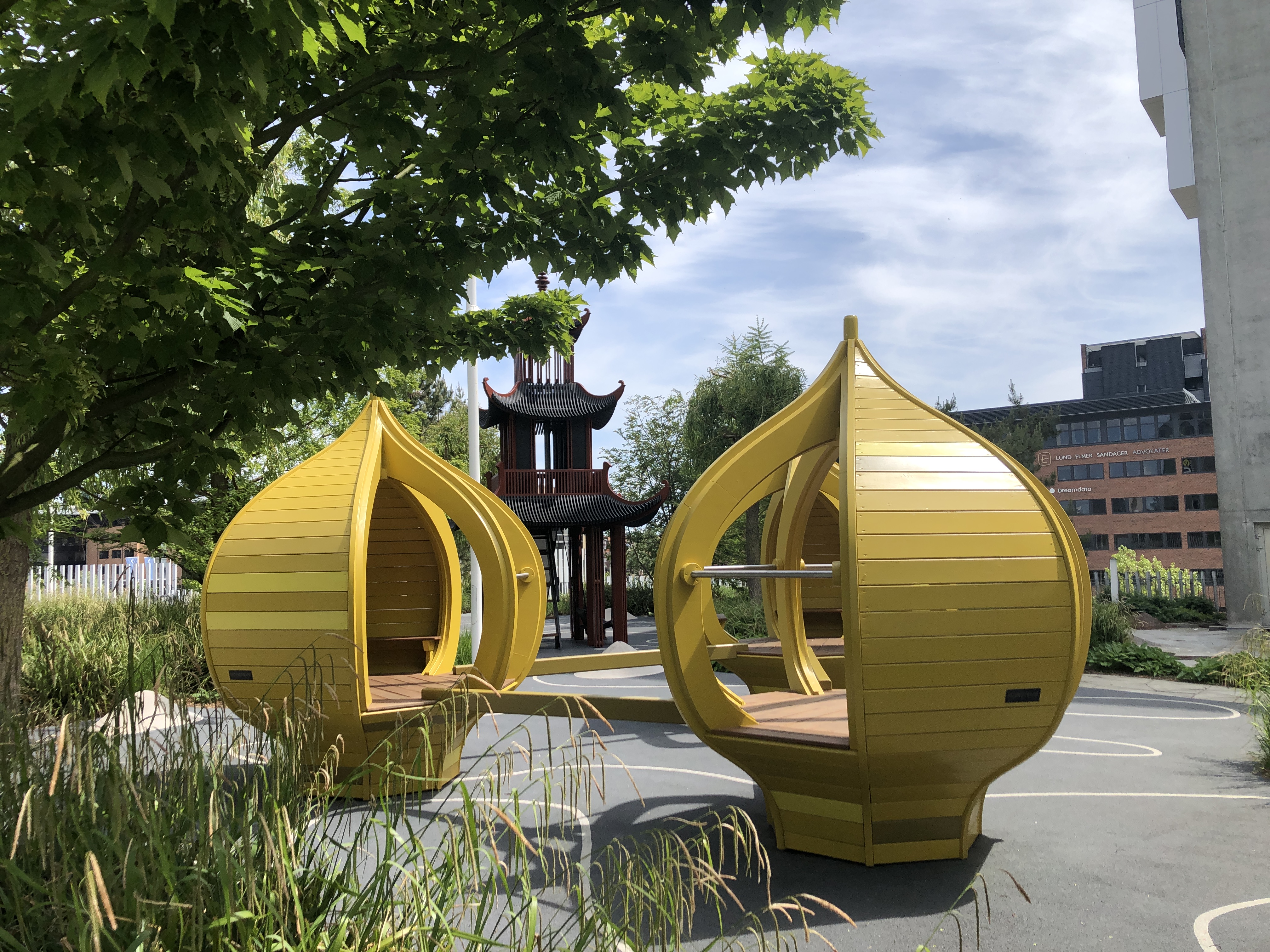 Næste stop på turen over tagene, er Hotel Tivolis taghave, hvor der også er blevet plads til en lille legeplads i Tivoli-kinesisk stil.