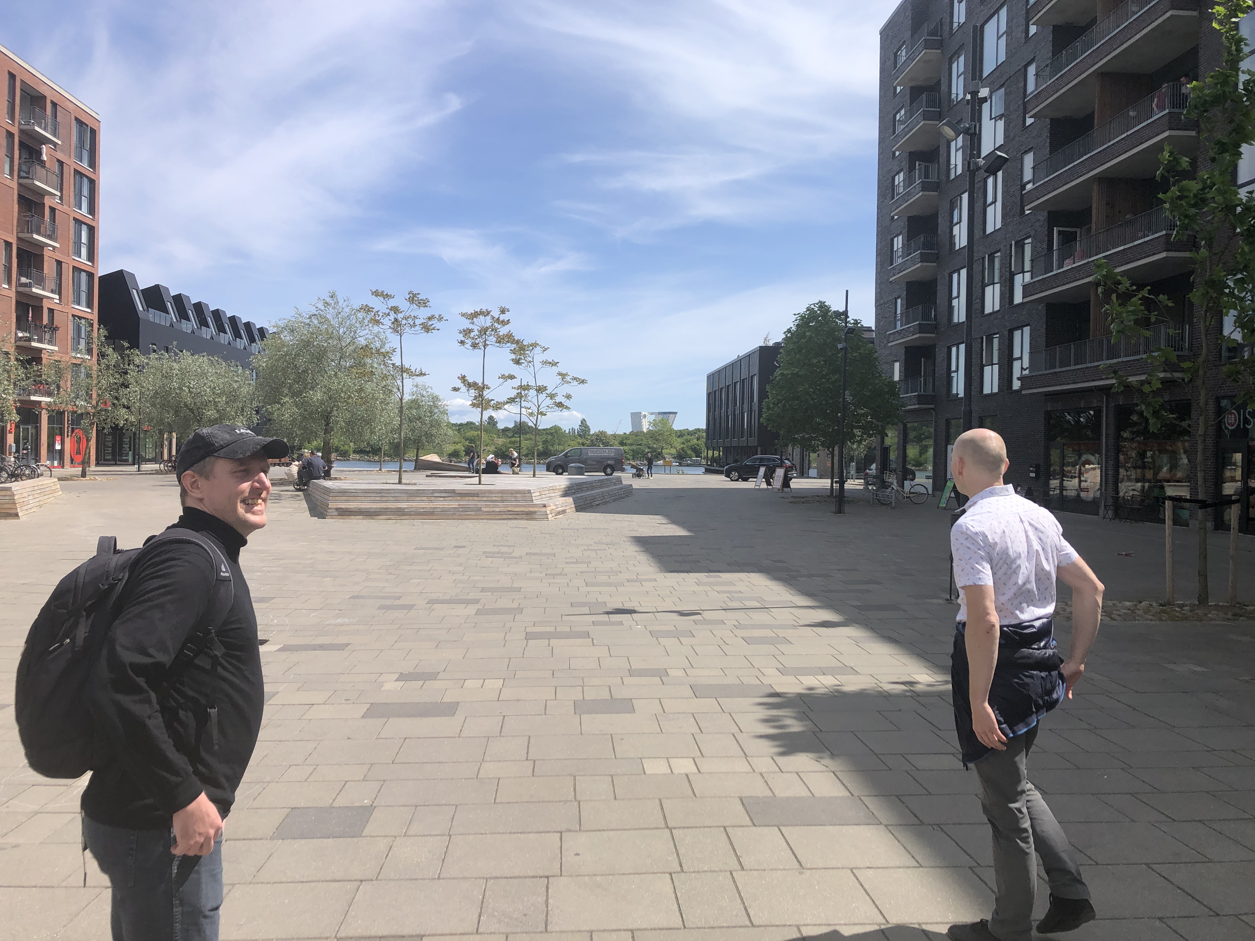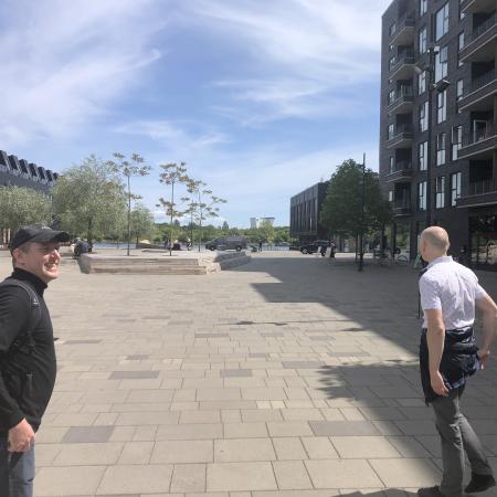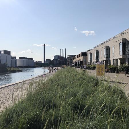Vi kantede os over den nordlige del af fælleden, der var hegnet af pga. det stillestående byggeri, hvor der var en tvist om naturen. Herefter ramte vi byen oppe i den sydlige ende af Islands Brygge.