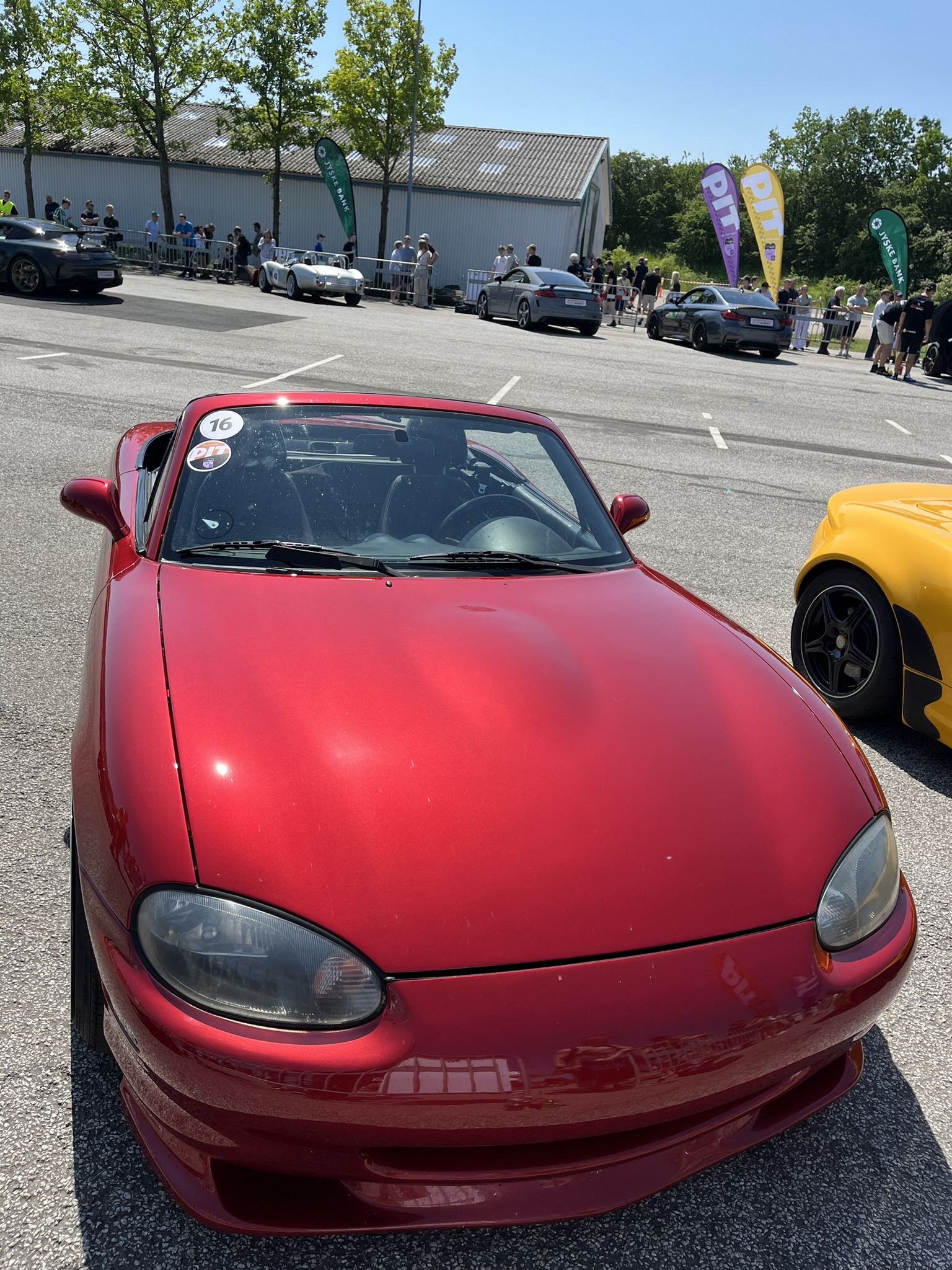 Vi spiste en hurtig frokost og herefter var det blevet tid til at køre Tesla, hvilket Kaya forevigede. Det varme vejr og turen på banen, havde øget dæktrykket i Teslaen med 0,8 bar, så han fik lige taget lidt luft af dækkene inden vi kørte. Heldigvis fik den ikke for lidt i svingene.