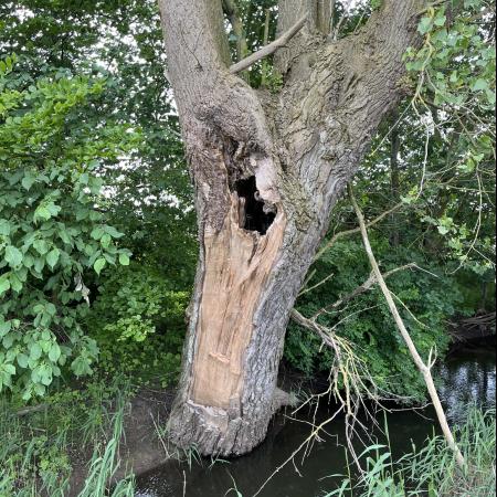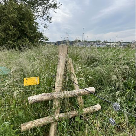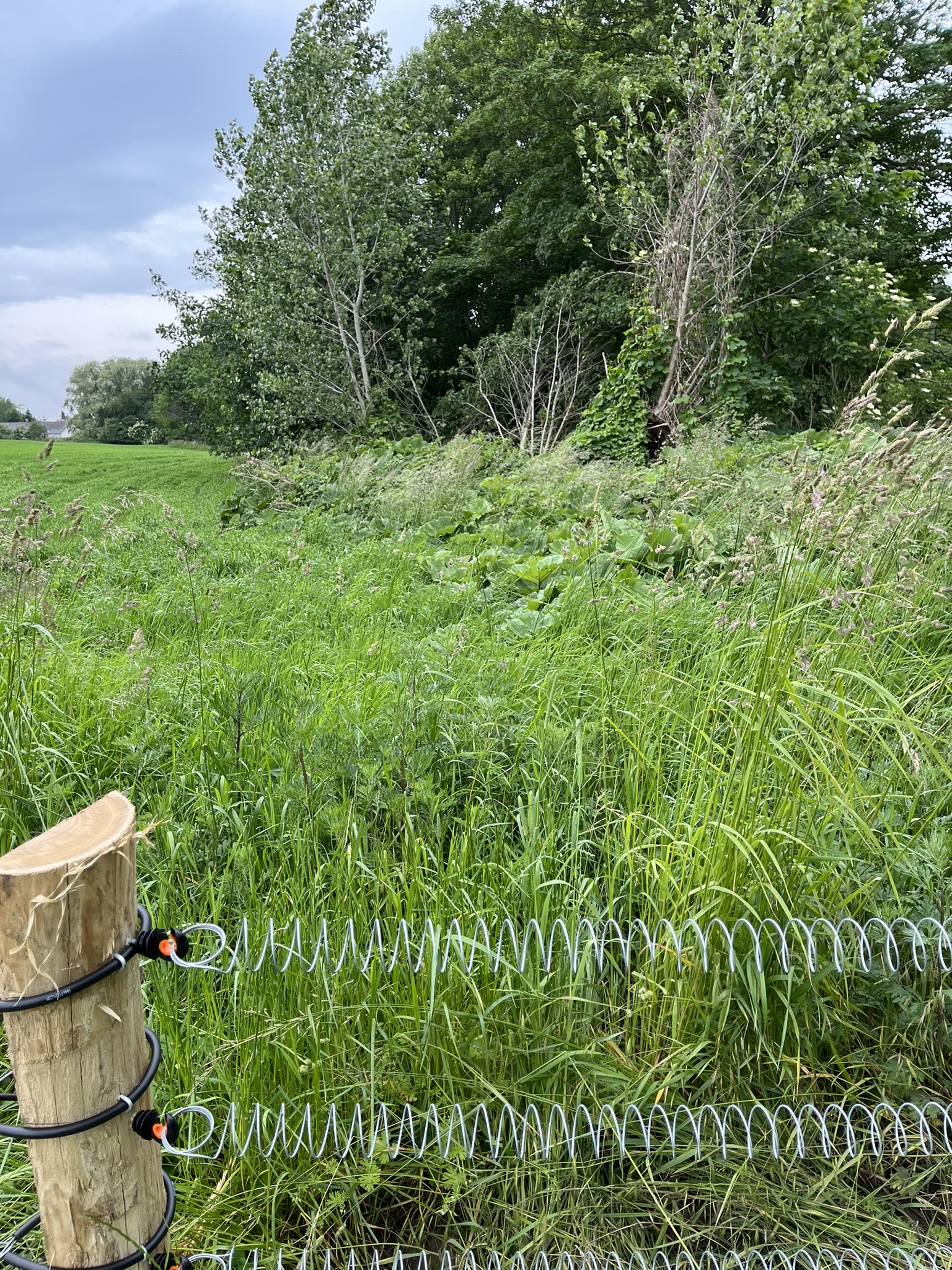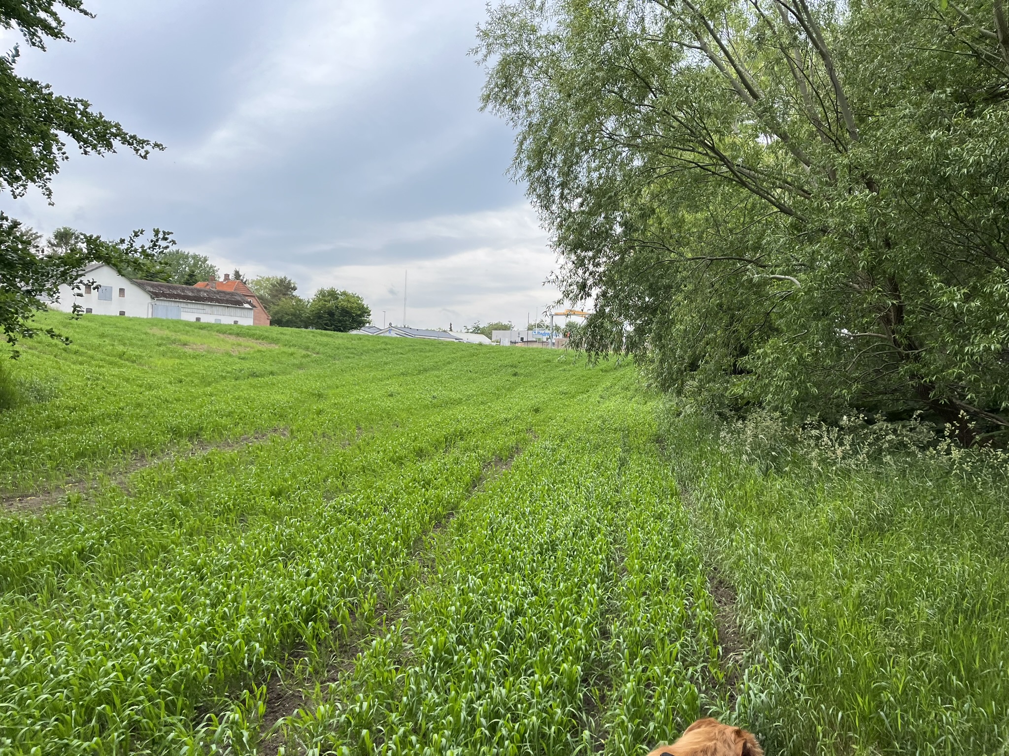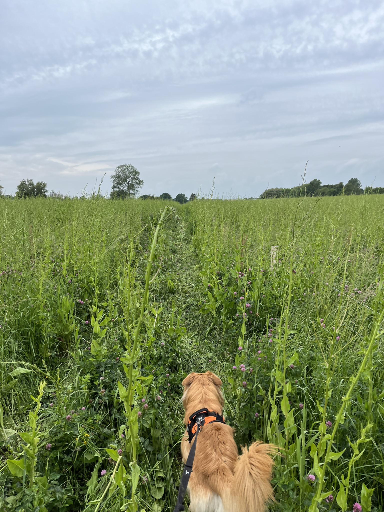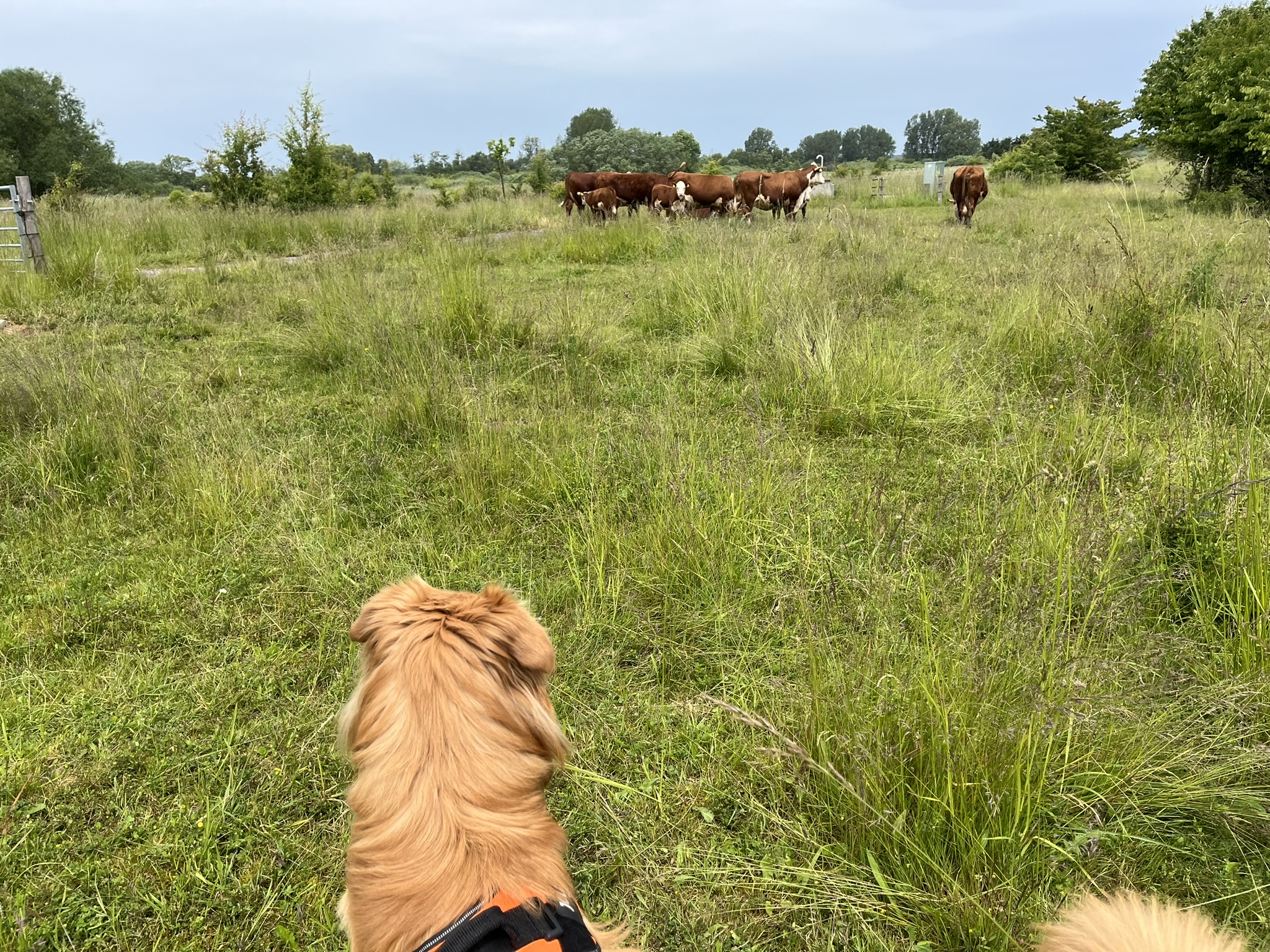 Et skilt havde annonceret endnu et område med vilde køer, og vi fandt dem helt bagest i området, hvor de nysgerrigt kiggede på os, som om de ikke havde set mennesker (eller hunde) i årevis. Et hegn ledte os væk fra å-kanten, men en låge lod os undslippe, men nu gik sti-kvaliteten markant ned. Det var en vildtgroende rapsmark, hvor en traktor nok havde kørt for et par måneder siden og man kunne snuble sig afsted i et af to hjulspor. Denne sti endte i midten af ingenting, men på den anden side af endnu et hegn, så det ud som om, at hjulsporene fortsatte, så vi forcerede hegnet og fortsatte, indtil vi kom tilbage til åen og endnu en låge, som ledte os ud på en græsmark.