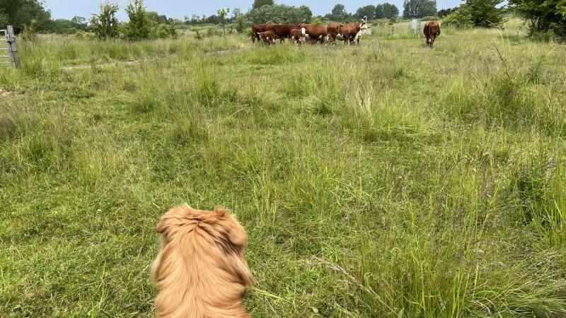 På vores side af motorvejen, har vi rødbroget kvæg. De stod stille og betragtede os, indtil en kalv pludseligt blev lidt nervøs over Targis tilstedeværelse.