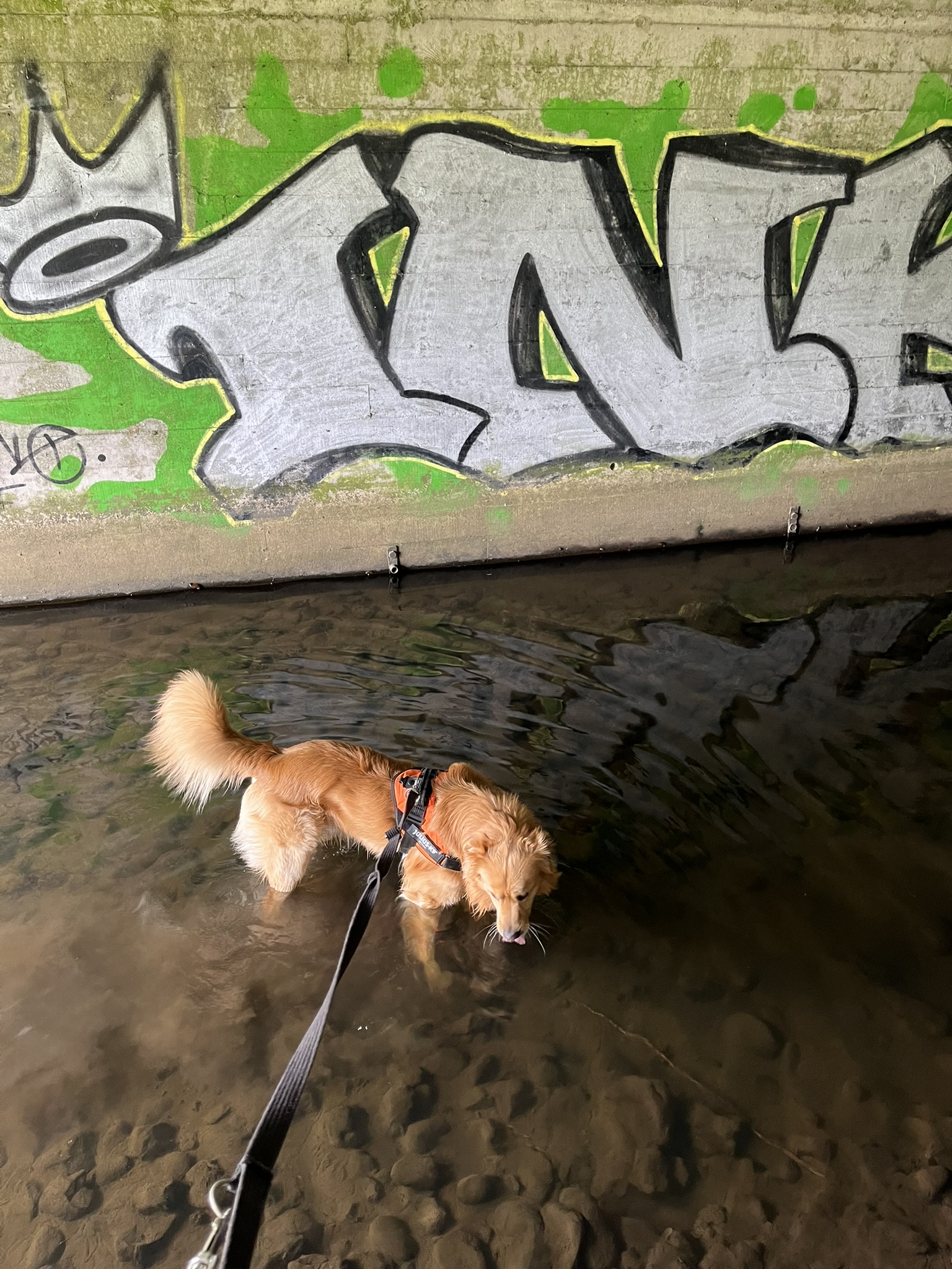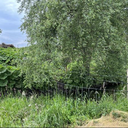 Vi kom en god kilometer, da vejen frem pludseligt var blokeret af et hegn, der gik hele vejen henover åen. Der var dog en låge i hegnet, men uheldigvis sad den syd for åen, som åbenbart var den side man var ment at traversere. Vi måtte derfor følge vores egne fodspor tilbage, men fandt heldigvis et vadested, så vi ikke behøvede at gå hele vejen tilbage til broen. Det kunne dog ikke traverseres uden våde fødder og våde poter.