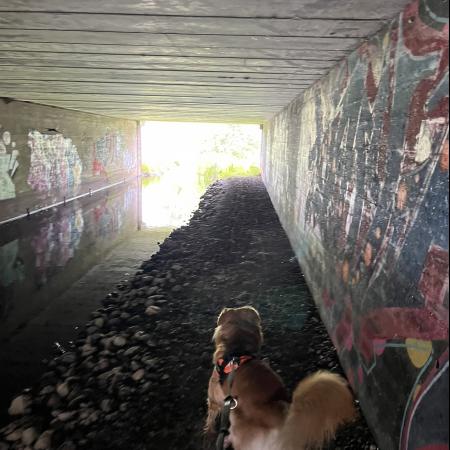 I det nordvestlige hjørne af området, fandt vi en afspærret bro, men vi fandt en vej, at omgå forhindringerne, og pludselig lå den foran os. Porten til den anden side og å-stien.