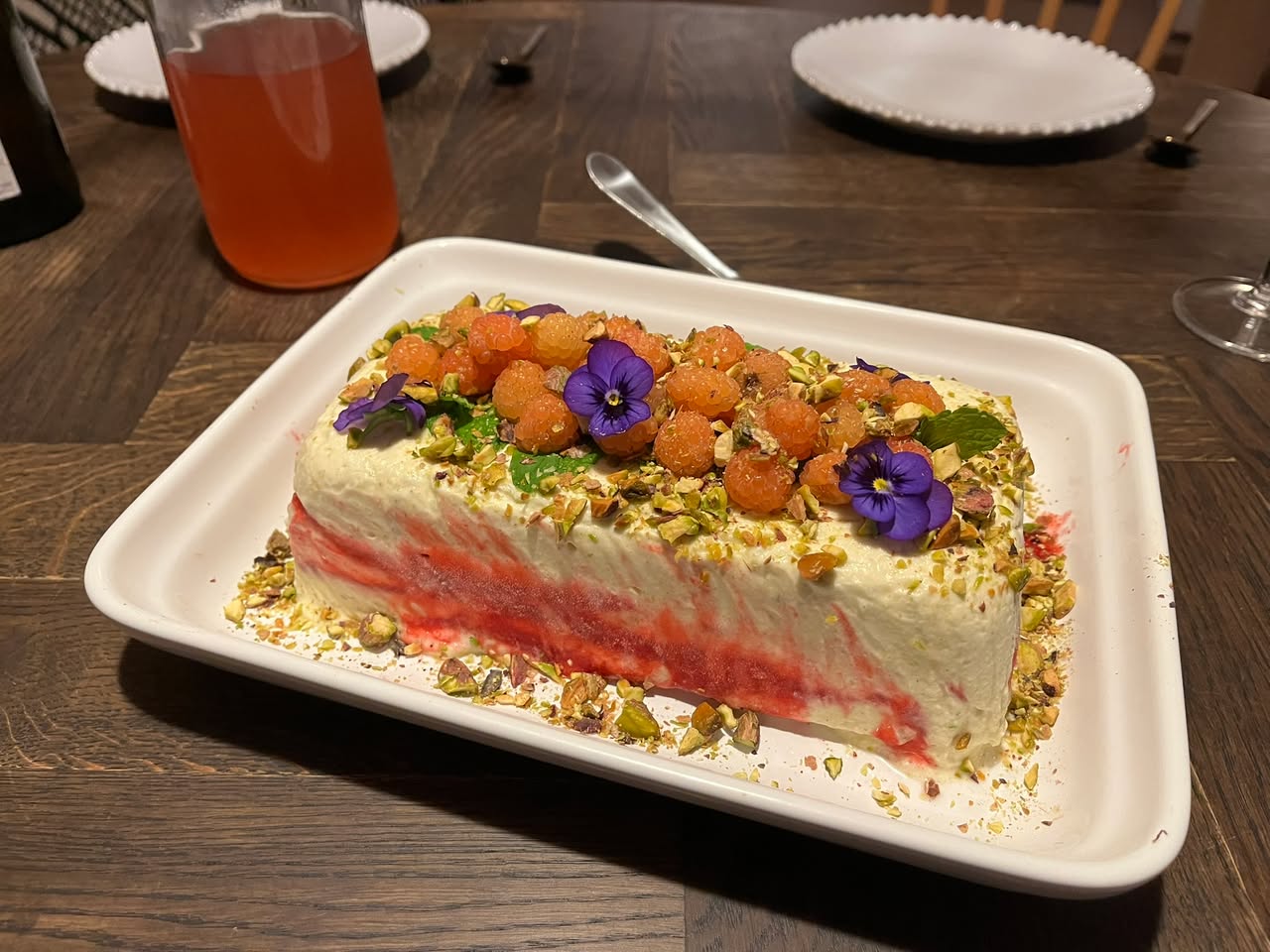 Der var hyben fra Revlen, både som frugter og blomster; tang fra havet og alverdens urter. Vores eget beskedne bidrag var omkring 18 gule hindbær der blev brugt til at pynte den ekstravagante isdessert, og til vores forsvar må vi sige, at de havde været godt bevogtet af en hær af edderkopper.