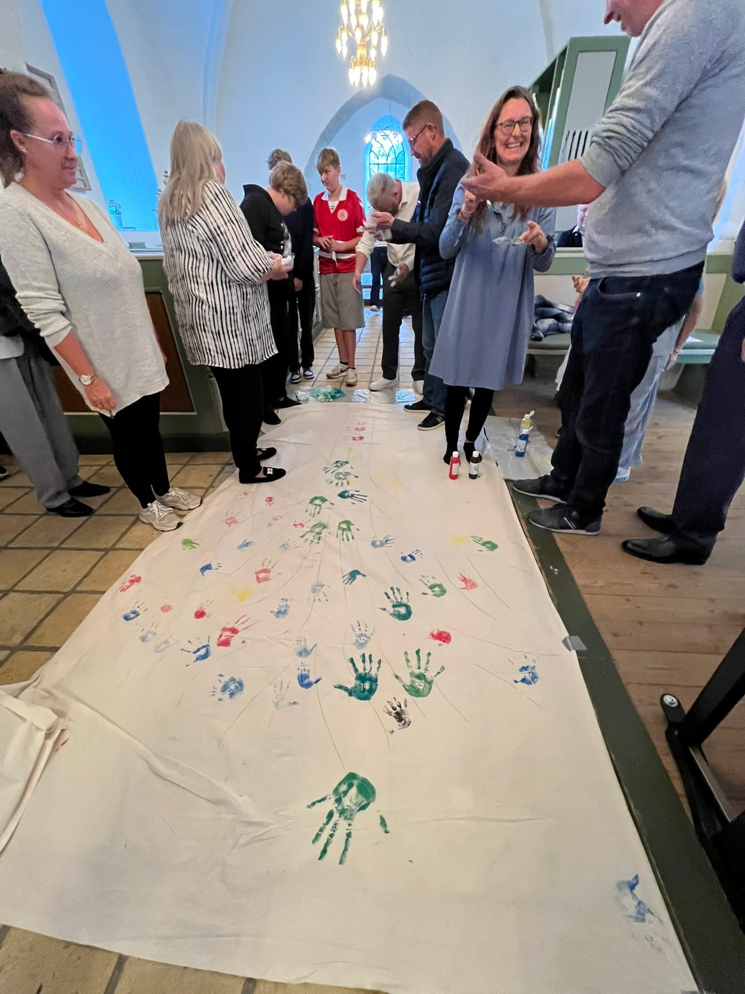 Det lykkedes mig helt utroligt at få lokket Sylvester med i kirke i dag, og det var ikke en helt almindelig dag, for der var både dåb, børnegudstjeneste og så skulle der konstrueres et nyt "livstræ", hvor man kunne sætte sit håndaftryk. Så nu er både Sylvester og jeg foreviget med hhv. blå og grøn farve.