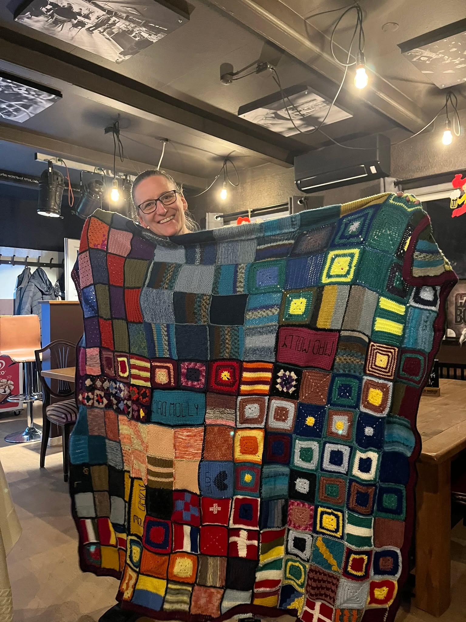 Vi fik også fremvist det fine Mad Molly tæppe som er blevet til igennem mange, mange timers samarbejde imellem de hæklende mennesker til Strik og Øl.